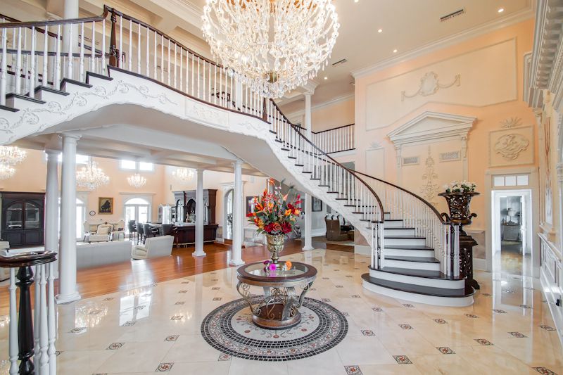 Free-standing spiral staircases frame the entry, as an elaborate chandelier hangs from a hand-painted dome ceiling.