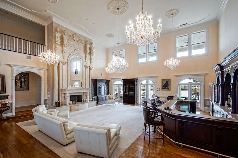 This mansion boasts 5,725 square feet. And the open living area is clean-lined and clad in soft hues of white, gray and powder blue.