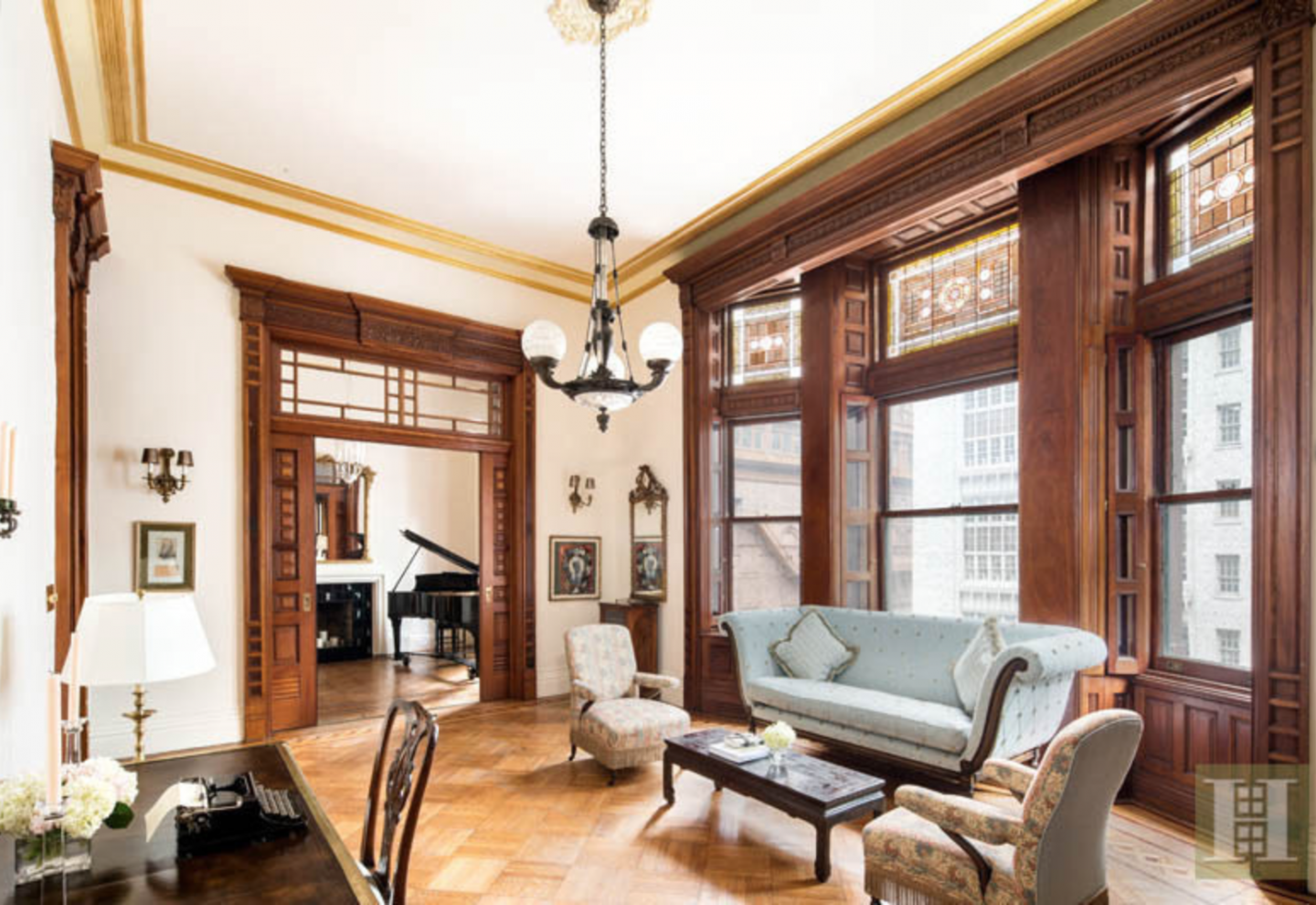 The 3,200-square-foot, nine-room duplex retains much of the same appeal it did when West Wide Story maestro Bernstein owned it: a narrow parlor, carved mahogany pocket doors, 1885 Parquet de Versailles floors, an ornate wrought-iron staircase, bay windows with original Tiffany transoms, and even a grand piano in one of its grand rooms.