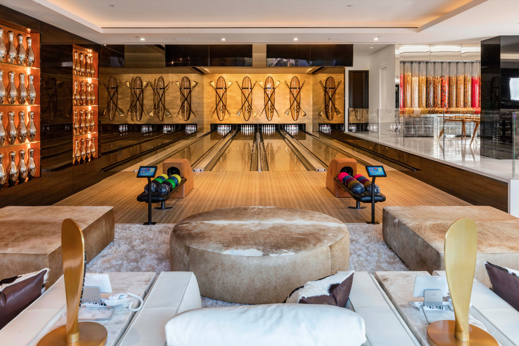 Its leisurely conveniences include a massage studio and wellness spa, a fully-equipped fitness center, an 85-foot glass tile infinity edge pool, a 40-seat $4,000 Dolby Atmos Theater, a four-lane bowling alley, an outdoor hydraulic pop-up theater, an Airwolf Bell 222 Helicopter sculpture and over 100 curated art installations throughout, two fully-stocked wine cellars, and a colorful assorted wall of candy.
