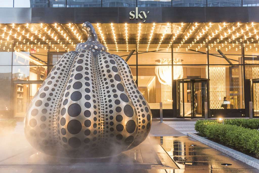 At the forefront of the building, an infinity loop motor court circles an enormous ornamental bronze pumpkin, dotted in black stone. It’s an original work of art by illustrious Japanese artist Yayoi Kusama that was commissioned for Sky, as were several other pieces showcased throughout the building. In the “Art Library” of the lobby, Kusama’s twin Infinity Nets paintings hang above the fireplace at each end as additional pieces of aesthetic elegance.
