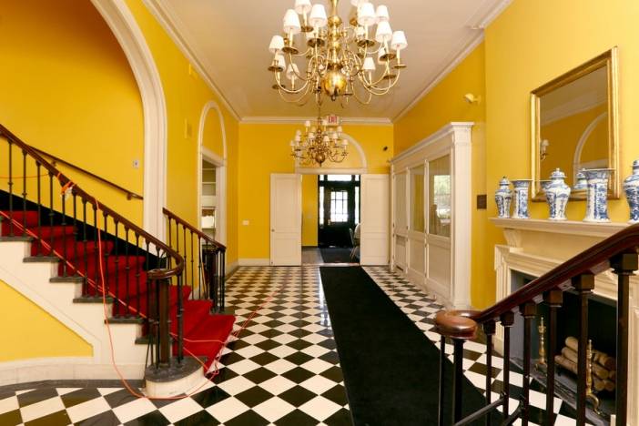 The 11,000-square-foot mansion showcases a neo-Federal style brick and wrought-iron-fenced exterior reminiscent of a Washington, D.C. embassy—down to its flying American and Spanish flags. The impressive interior features ornate plaster moldings, oversized windows, lavish mirrors, elegant winding staircases, marble fireplaces with carved mantles, and lofty vaulted ceilings decorated by tiered chandeliers. It also boasts a huge grand parlor, a distinguished library, and a courtyard terrace.