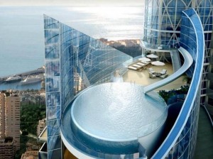 The Odéon Tower in Monaco has a rooftop, infinity pool with a water slide that creates fairytale living at its