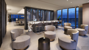 Check out this amazing home bar, complete with 22-foot marble countertop, leather-tufted stools, ceiling complete with wood and aluminum, and