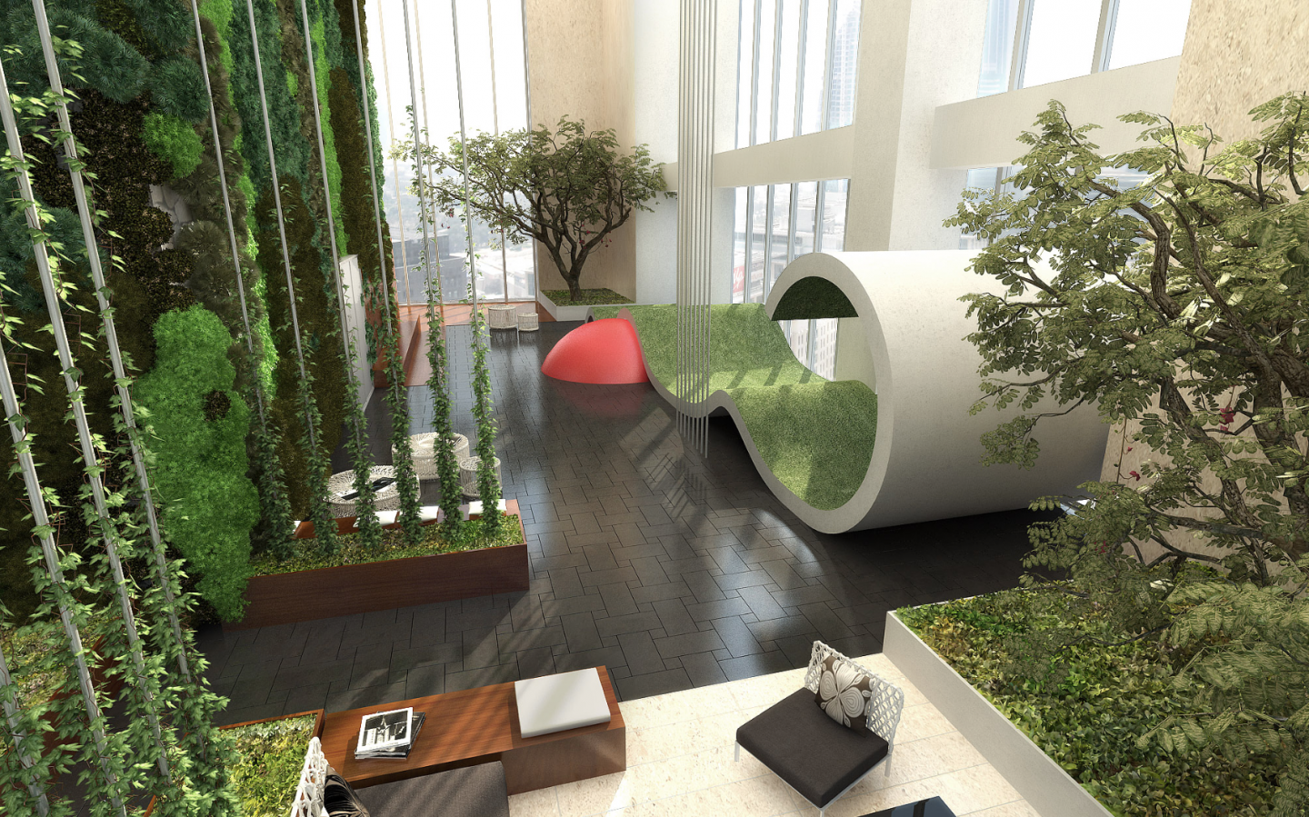 Instead the Maze Tower boasts the Maze Eye: an eight-meter circular video wall at the top of the building that beams images at great distances, and LED lights built into the exterior façade of the maze pattern, which can display a variety of colors and patterns (like the Pac-Man game). The building also features urban, green sanctuaries—two floors of tranquil gardens (with trees, planted walls and a children’s play area) in the middle of the building, and a rooftop garden maze.