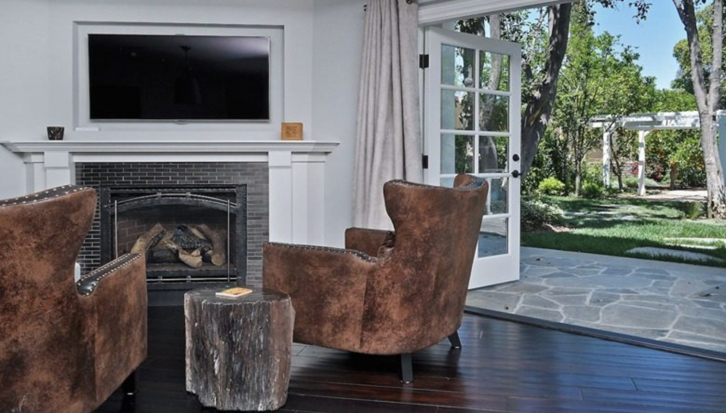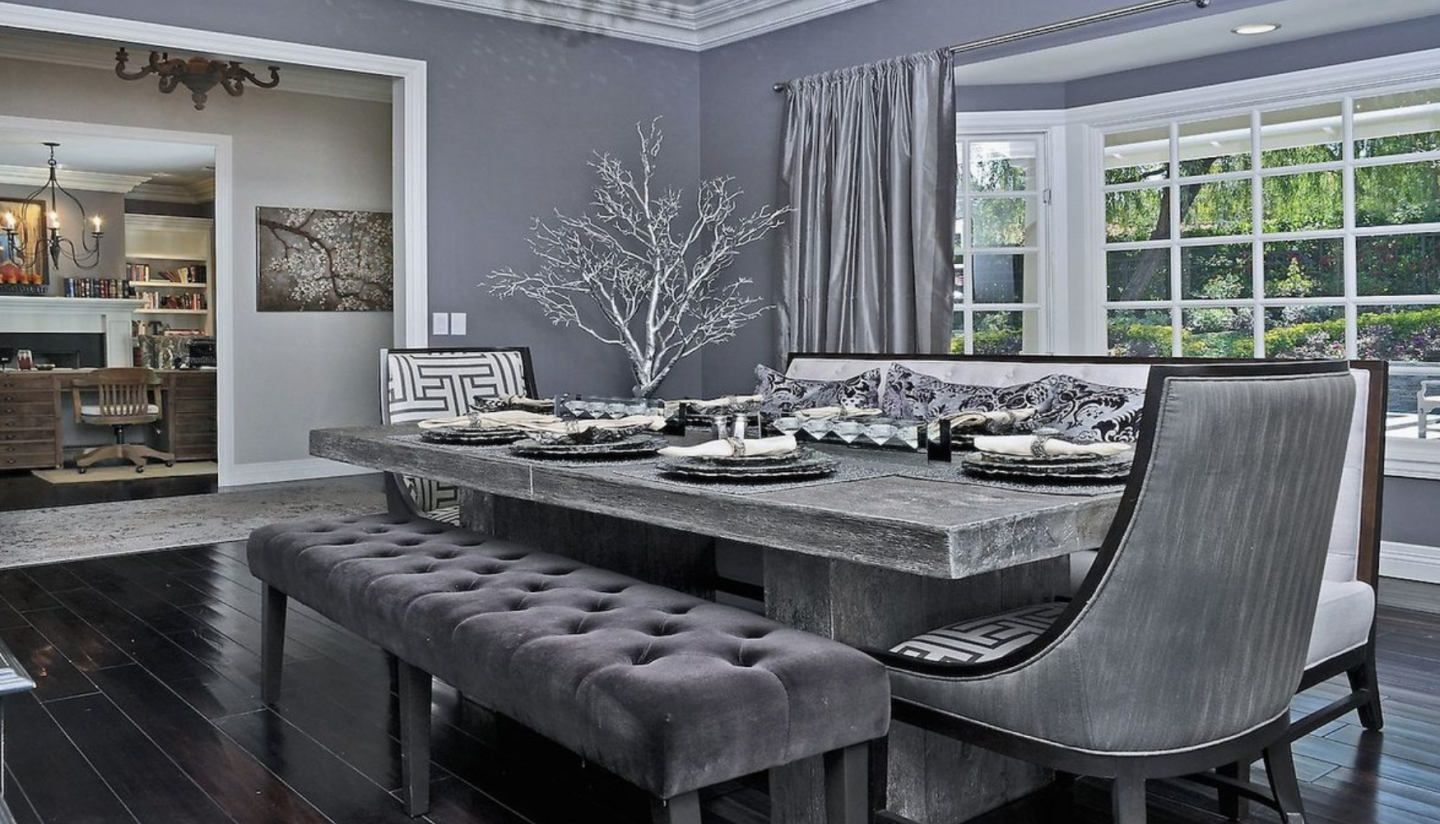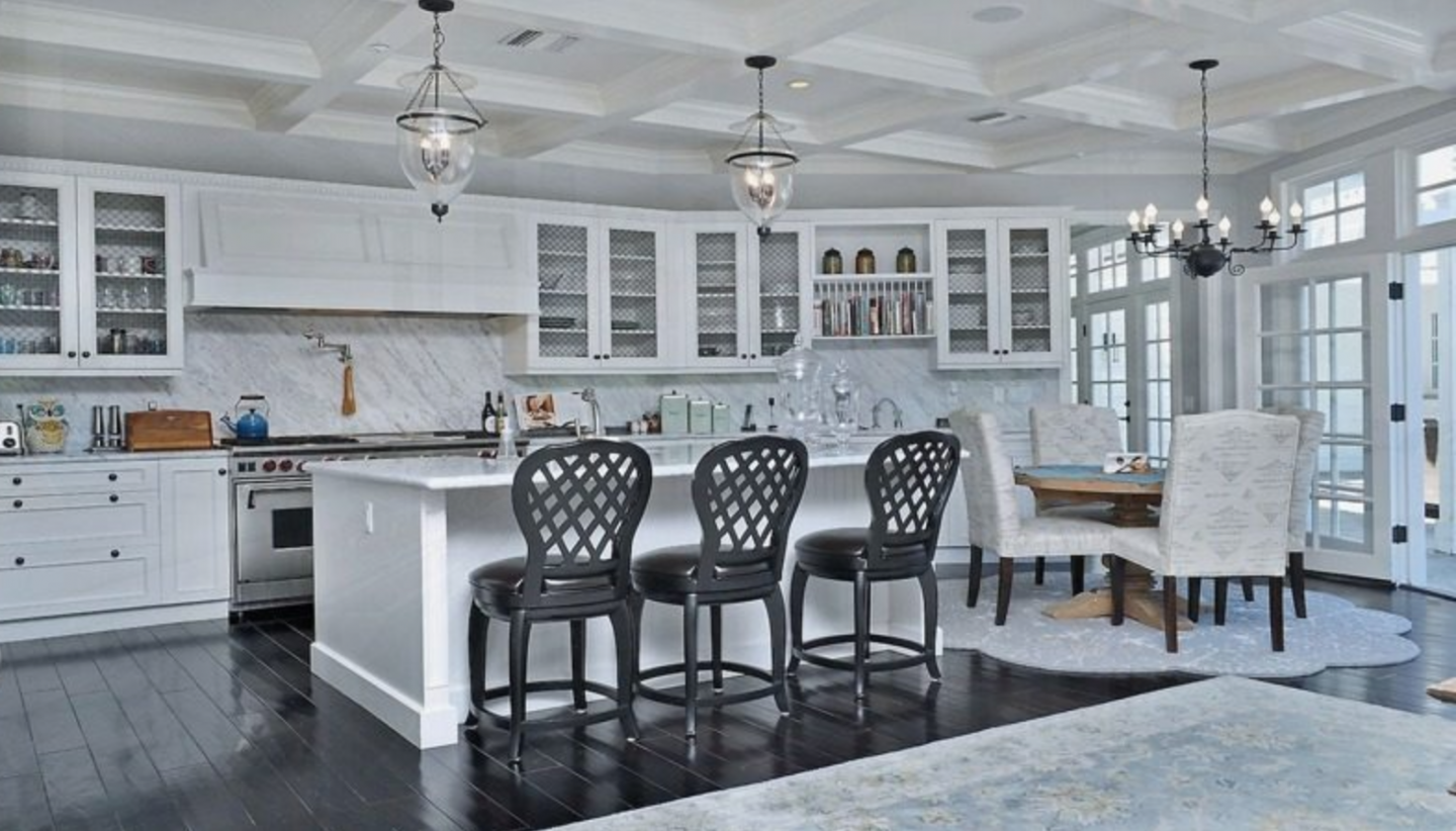 Showcasing an all-white exterior, the single-story main home’s interiors are transitional (alternating from contemporary to traditional from room to room) with French doors, beautiful dark hardwood floors, extensive molding on ceilings, trendy matte gray palettes, and a variety of pendant lights. Living and dining areas are bright with bay windows that look overlook stone terraces and the large yard.