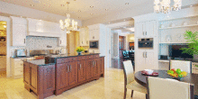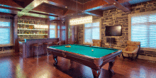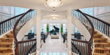 The home is defined by a two-story parlor with an eight-foot Swarovski crystal chandelier and features sweeping staircases, luxurious marble floors, a men’s parlor, bar & games room, dance studio, spa, home theatre, wine-tasting room, separate carriage house and five-car garage. The home was designed and built by Pacer Signature Homes.