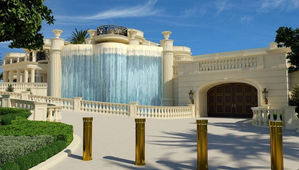 Encircled by a gate decorated with 22-karat gold leaf, this magnificent dwelling is bursting with the finest amenities, including a $2 million marble staircase, 30-car subterranean garage, and an 18-seat IMAX theater with a 50-foot-widescreen. And if the state-of-the-art security system is not up to par, there are also kennels on the lower level built specifically for guard dogs—for extra protection.