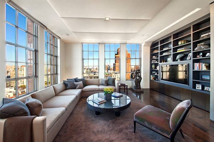 One of 21 residences in the Skyloft building (located at 145 Hudson Street), this 4,120-square-foot condo—currently on the market for $13.175 million—lies in Manhattan’s coveted neighborhood of TriBeCa.