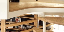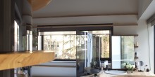 He also wanted the house to be luminous and airy. To capture as much light as possible, he built a protruding transparent cube on the top floor that touches the treetops. Next to it is an outdoor terrace with views of the grounds, while a small Japanese garden on the balcony floats in between the master bedroom and bathroom. Incorporating ambiguity between indoors and outdoors was also paramount. “When I open the door, everything inside is outside, and everything outside moves inside,” Joulia says. Each room of the house also offers a view of the exterior.