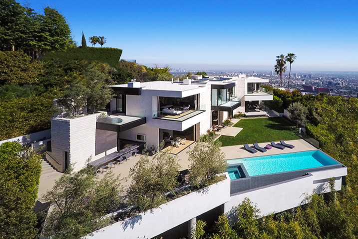 The complex was sold fully-furnished with world-class decor by IN-EX showroom. Outdoors, there is a large, grassy lawn; a full outdoor kitchen; fire pits; and a saltwater infinity pool against the Los Angeles skyline.