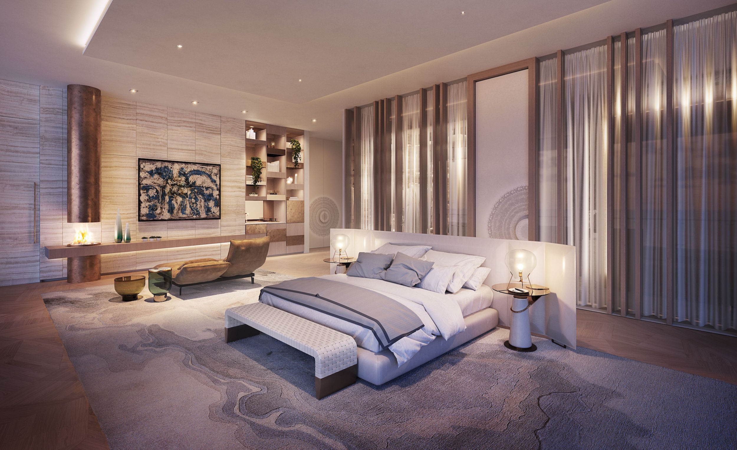 Inside the penthouse, the master living room will boast an expansive entertaining room with a gourmet chef’s kitchen and a sculptural wine cellar facing the ocean. There will also be a behind-the-scenes preparation kitchen for special culinary events, while a lounge area will connect the interiors with outdoor spaces. The master bedroom will be a “must-see” – outfitted with his and her closets and a unique bath with a shower and floating tub overlooking the ocean. Just beyond the master suite will be a special spa area, encompassing plunge pools, a massage area shaded by a trellis, and an outdoor sauna for relaxation and extended therapies. Ideal for fitness buffs, the home will have a private gym, as well as a skylight turf with a green area that’s perfect for putting practice. Entertaining in the penthouse is a dream thanks to a uniquely designed club room, complete with a pool table, antique bar, and a plush home theater. Additional standout features in the residence will include a private oceanfront office, a fully-equipped summer kitchen, an art gallery wall, and a one-of-a-kind pool that juts out over the building – blurring into the ocean beyond.