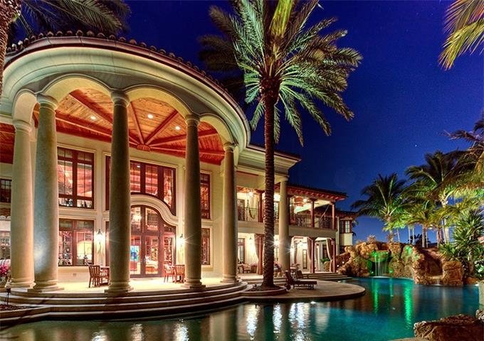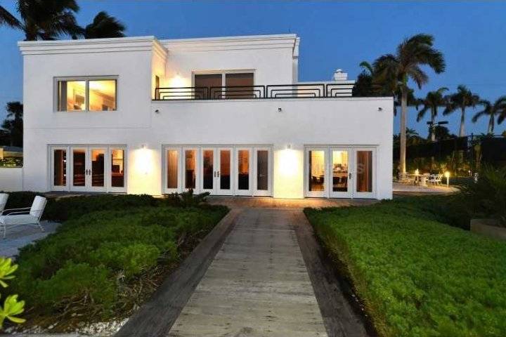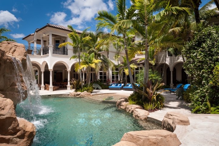 This majestic 31-room estate has a double point lot, 650-inch water frontage, three docks, and outstanding views of the Intracoastal Waterway. Also featured within the 2000 square feet of property, is a stone fire place, volume ceilings, marble, and wood floors, a gourmet kitchen, a seven-car garage, a resort-style pool with water fall, a water slide, an in-pool bar, a Jacuzzi, Spanish-style verandas and gardens, and a three-room guest house. It is walking distance from the local golf and country club.
