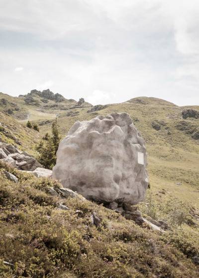PIC FROM CATERS NEWS – (PICTURED: The chalet not in the snow ) – Taking the term mountain cabin literally, this one-person chalet has been built inside an artificial rock boulder and camouflaged in the Swiss Alps. The camouflaged cabin comprises exposed timber walls, floors and ceilings, encased within a concrete shell. The only giveaway from the exterior is a couple of small windows and a recessed doorway. SEE CATERS COPY.