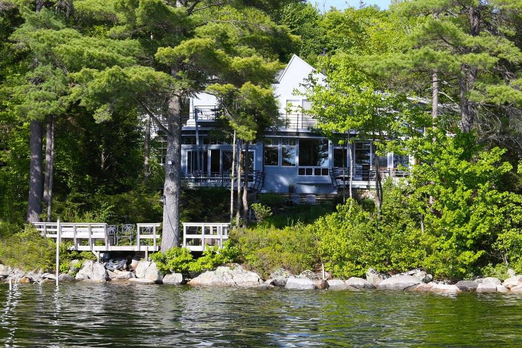 “Safe Harbor” is a Timberframe family compound modeled after the Great Adirondack camps. Designed by renowned architect, O’Neil Pennoyer, this Lake Sunapee property offers four separate dwellings with connected roof lines and common outdoor living spaces. Nestled on three-and-a-half acres with a 363-foot shoreline, the buildings consist of a three-bedroom main house, a one-to-two-bedroom guest house, a two-car garage with heated studio and golf simulator, and a three-car garage with unheated second floor summer bedroom. Two screen porches open to a courtyard with gardens and reflecting pool. Meandering paths lead to a sandy beach and two deep-water boat docks. Overlooking Burkehaven Harbor, Fishers Bay, and Mount Sunapee ski trails, Safe Harbor is an unique combination of inspired architecture blending with nature––a historic part of Lake Sunapee––and complete privacy. Safe Harbor is for sale for $3,750,000.