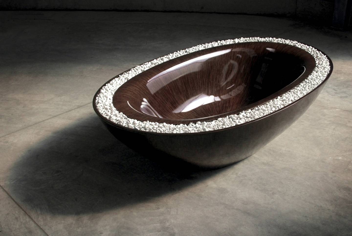 Crafted out of certified wood harvested from forests with controlled felling and reforestation, this unique wooden tub by former Swiss yacht-building company Alegna can be filled to the brim without fear of it overflowing: excess water is captured by the surrounding pebbles, and seeps down through concealed drains.
