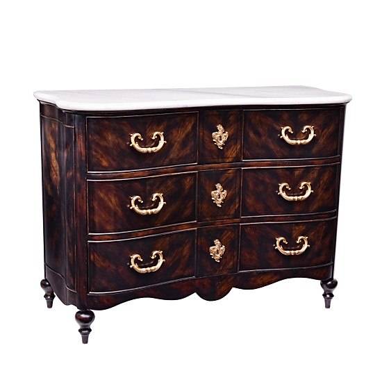 The Marseilles collection, exclusive to Bloomingdale’s, gives a nod to French Provincial and classic Continental style. This solid mahogany dresser—regularly priced at $7,575—is adorned with cherry veneers, a carved base Italian Carrara marble top, and solid brass hardware.