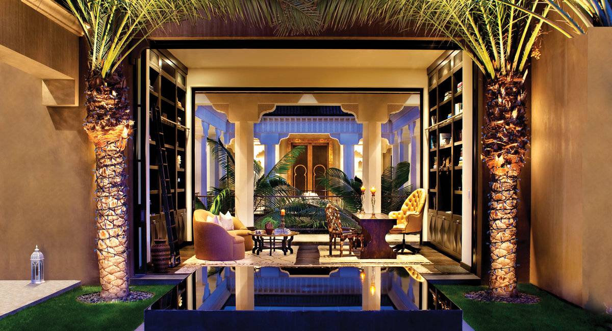 The Cove’s master suite—located steps from the lap pool—is accompanied by a spa-like, white marble bath, equipped with a Moroccan soaking tub. Apart from the three outdoor dining spots—which can fit up to 200 guests—the home’s formal dining space emulates a Moroccan tent, with romantic draped ceilings and French doors leading to a terrace.