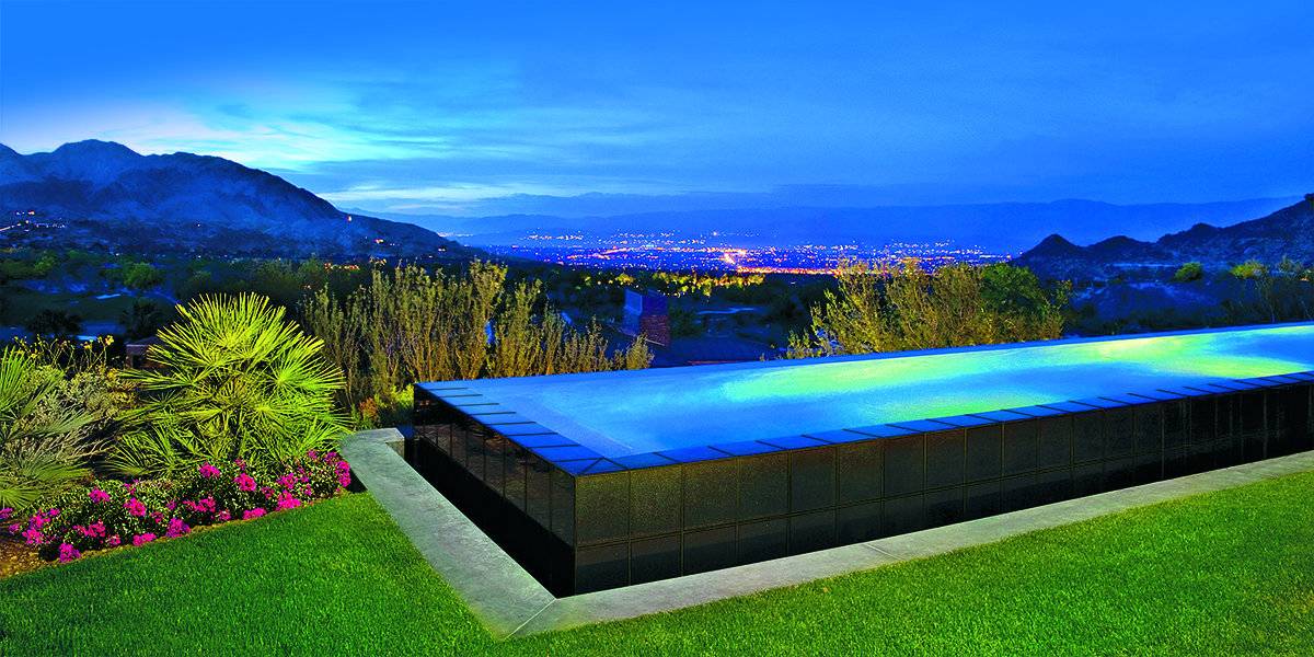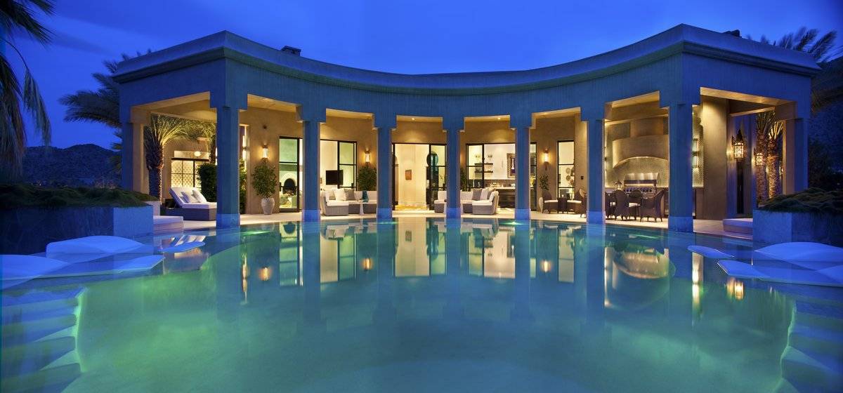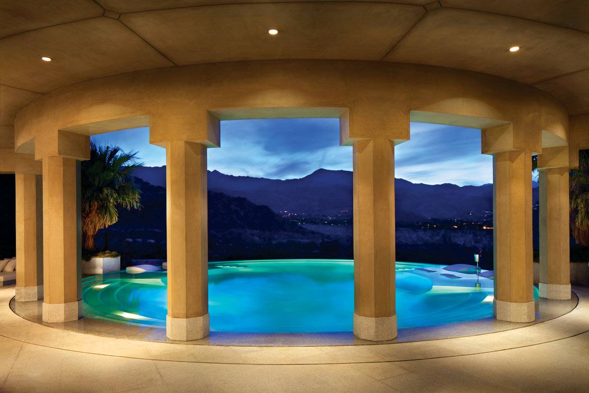 Phenomenal 30-foot by 40-foot retractable glass ceilings shelter the courtyard, while a posh hammam spa with an organic spa bed, a fireplace, full-sized massage tables, and an expansive steam room and bath surround a well-manicured atrium complete with a fountain. Also on the grounds sit a 75-foot black granite-lined infinity saltwater lap pool, as well as a 40-foot round reverse infinity-edge swimming pool. There’s also a plush hookah room that can accommodate up to 20, featuring glass doors that lead to a 20-foot movie screen set against a mountainside backdrop; an elevator whose inner walls are splendidly lined with mother-of-pearl; nine built-in flatscreen televisions; a temperature-controlled wine cellar; and a three-car, two-golf-cart garage.