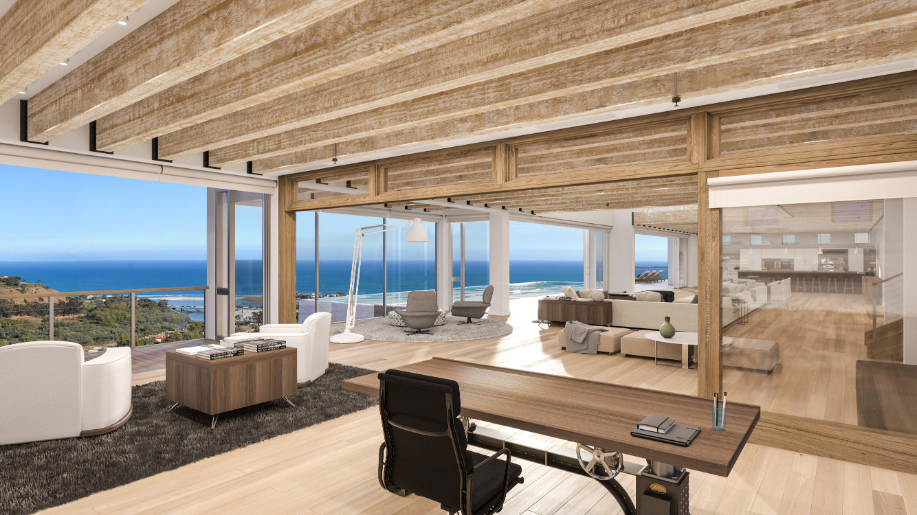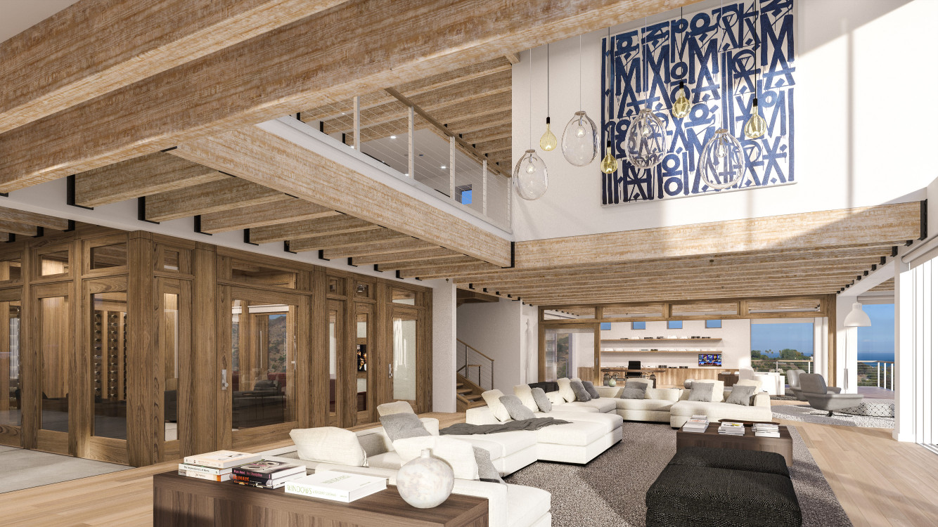 Encased in floor-to-ceiling, sliding glass walls, the 10,500-square-feet main home is furnished by high-end designers, Minotti and Bottega Veneta, with custom pieces including handmade rugs from New Zealand and a 12-foot, hand-hewn, teak dining table. Custom teak doors and cabinetry, as well as 80-year-old, dry-aged oak flooring is featured throughout, along with artwork by Ellesworth Kelly and Jonathan Burofsky. Gillen originally envisioned staging the property with an airplane as a chandelier. Now, he plans to have a motorcycle on display.