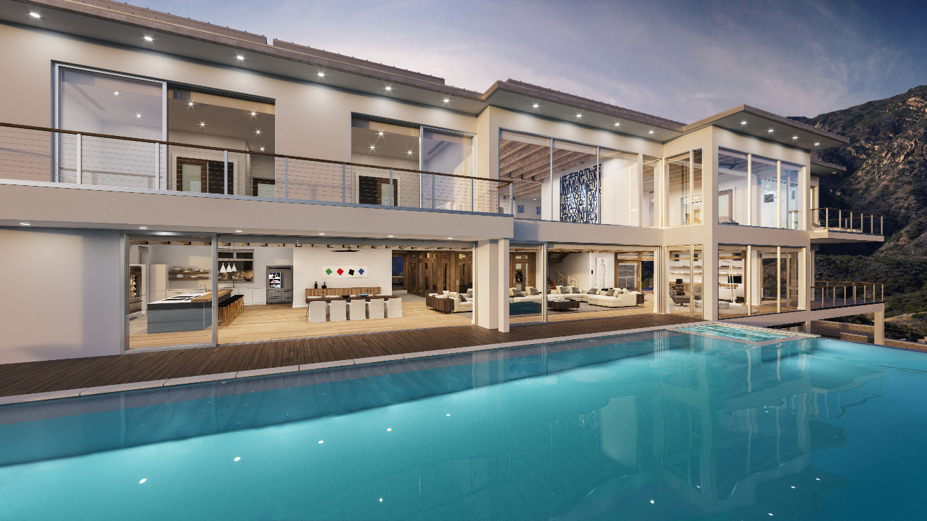 There is a wine tasting room, game room, and media room, which opens outside to the 75-foot infinity pool, with a cascading waterfall.