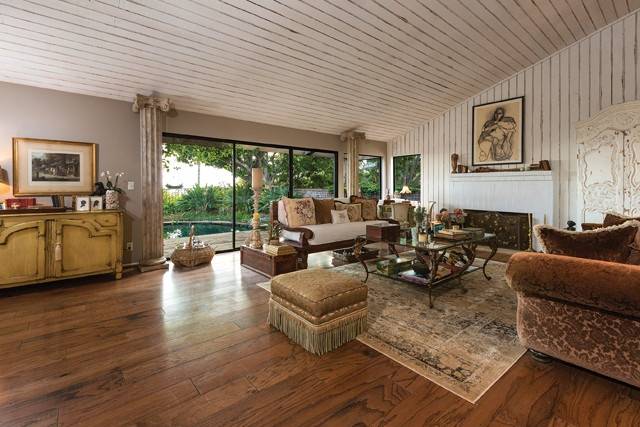 The house has four bedrooms, three baths, a living room fireplace, a wet bar, and distressed wood ceilings for additional charm. The pool and spa are accessible via sliding doors in the master bedroom. A private outdoor sitting area extends from the master bath.