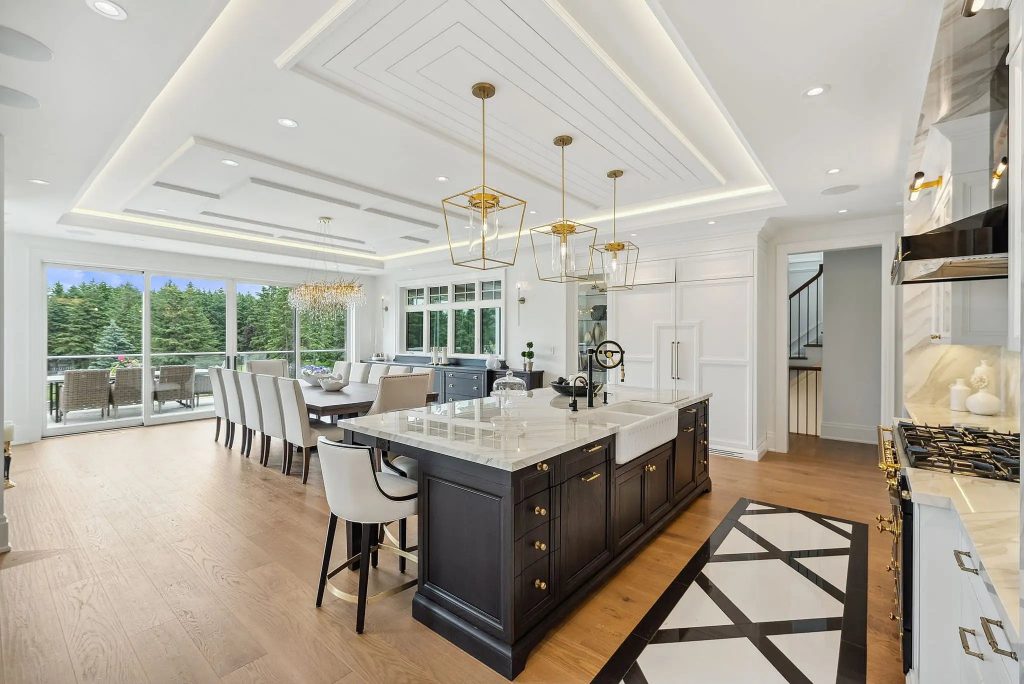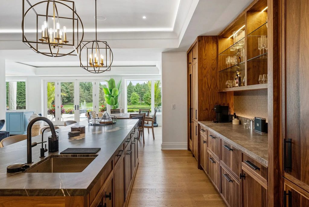The primary residence was designed for large-scale entertaining and extended family living. Interior spaces include a champagne bar, dual-sided fireplace, gourmet kitchen with top-tier appliances, and an east-facing primary suite with dual ensuites, steam showers, and a custom dressing room. An open-riser staircase and elevator connect multiple levels, including additional bedrooms, a library with ensuite baths, and an expansive entertainment room with walk-out access.