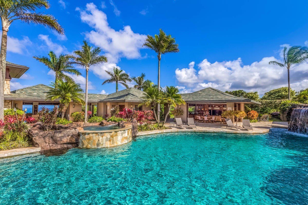 PERSONAL PRIVATE RESORT on 3+ acres is situated on a bluff overlooking Kahili Bay and beyond. This Hawaiian influenced design boasts incredible features throughout. The six pavilions include Master bedroom suite with ocean view whirlpool tub/ steam shower. Gourmet Kitchen with all stainless appliances including 6 feet of Sub Zero refer and freezer/ Sub Zero chill drawers/ 4 ovens and commercial range/ 2 Fischer Paykel dish drawers/ warming drawer and more. Dining Room, temp humidity controlled wine room. Home theater/ media room with wet bar. Sound system through the entire residence and pool area. 5 guest suites, with an option for a 6th, laundry, whitewater ocean views from Master, kitchen, great room, study, guest suite. Huge garage with plenty of storage for all your toys. Splash in the 100+ foot tropical rock pool w/ swim up Bali style bar/ large waterfall grotto/tunnel water slide, and separate ocean-view spa. A few of the many superb features are Crestron touchpad controlled lighting-AC-stereo, extensive use of numerous exotic hardwoods, numerous pocket doors for indoor-outdoor living, true slate roof, beach sand exterior finish, koi pond, fireplace, barbecue and much, much more. In gated, quiet, secure Seacliff Plantation adjacent to Kilauea Wildlife Refuge and Lighthouse. Seacliff owners enjoy exclusive deeded access into the crater hill bird sanctuary with amazing views of Bai Hai and beyond! To purchase land and construct this incredible luxury estate today, would far exceed what you can purchase this ready to go personal resort right here, right now!