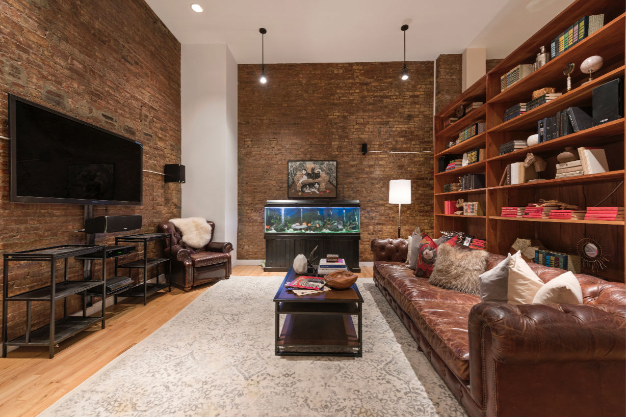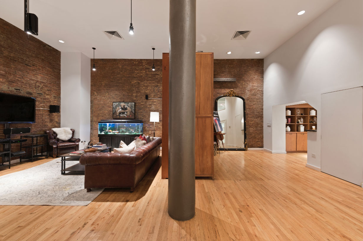 The converted three-bedroom, two-and-a-half bathroom, 3,400-square-foot apartment was designed by McKim, Mead and White architects to preserve the exposed brick and double-height windows in the building’s original construction.