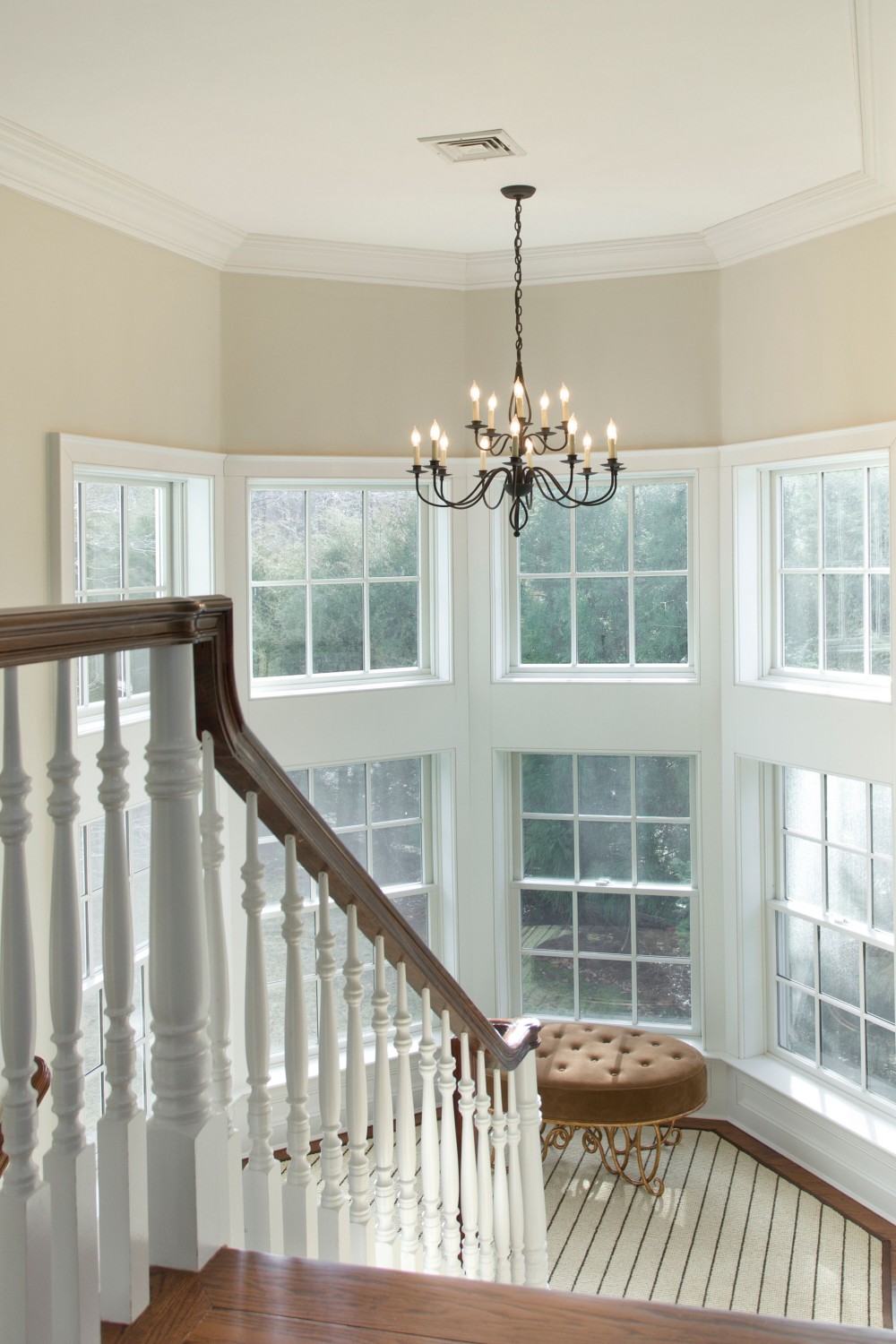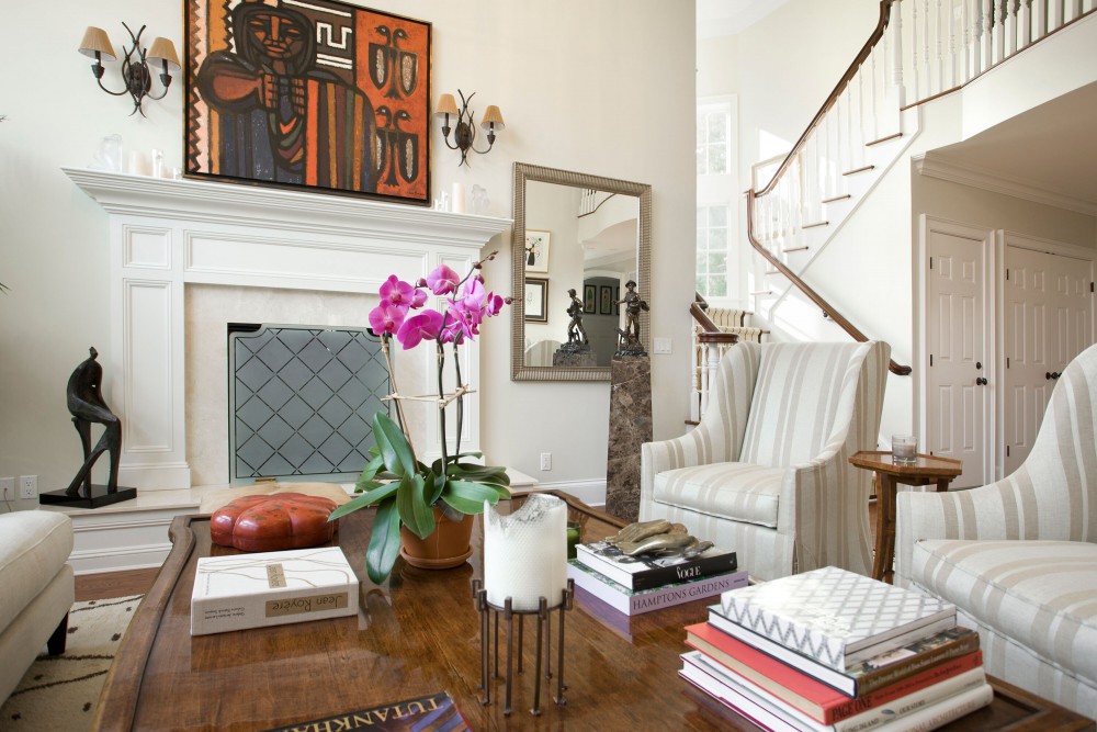 “The living room was 2 stories high so I brought it into scale by using 4 hanging lanterns without glass to define the space. Another dramatic look was of the striped runner that outlined the staircase.”