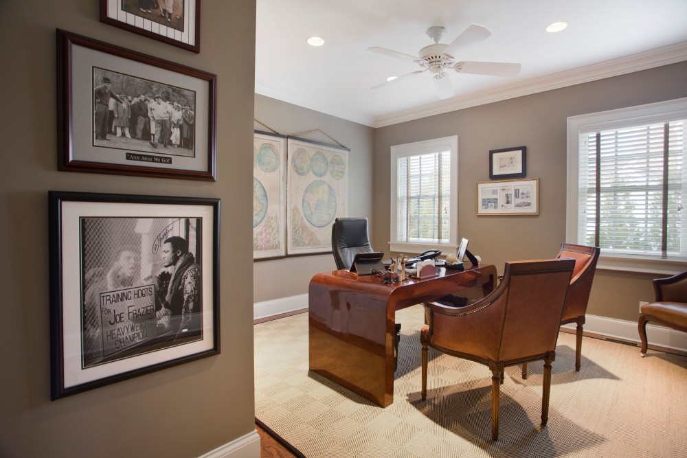 “A black and beige area-rug gave the family room a dramatic tone yet it was casual for family living.”