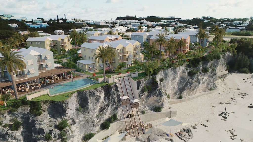 Buyers at Bermudiana Beach Resort will have access to various amenities, including a cliff-top infinity pool and bar, a restaurant, a spa, a hotel reception area, and an additional swimming pool for children.  A two-car funicular elevator will take guests to the pink-sand beach below.