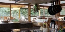 The 21,500-square-foot main house is designed in the form of two overlapping grids. Modular timber beams snap together to form six bedrooms, the master suite, the living areas, and a large kitchen. The grid design enables a functional arrangement of rooms in which the living areas and master bedroom are in the same module, and the remaining three modules are reserved for guest or children’s rooms. In consideration of the naturally damp climate, the architects built the one-story home on pillars.