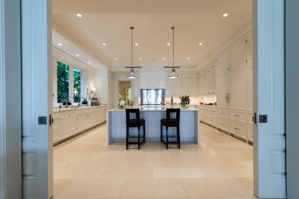 A chef’s-style kitchen displaying twin islands, snack bar seating and an adjacent casual dining room. Social areas range from gracious formal living and dining rooms, to a comfortably inviting family/media room. Downstairs offices and an upstairs library are complete with handsome built-in shelving.