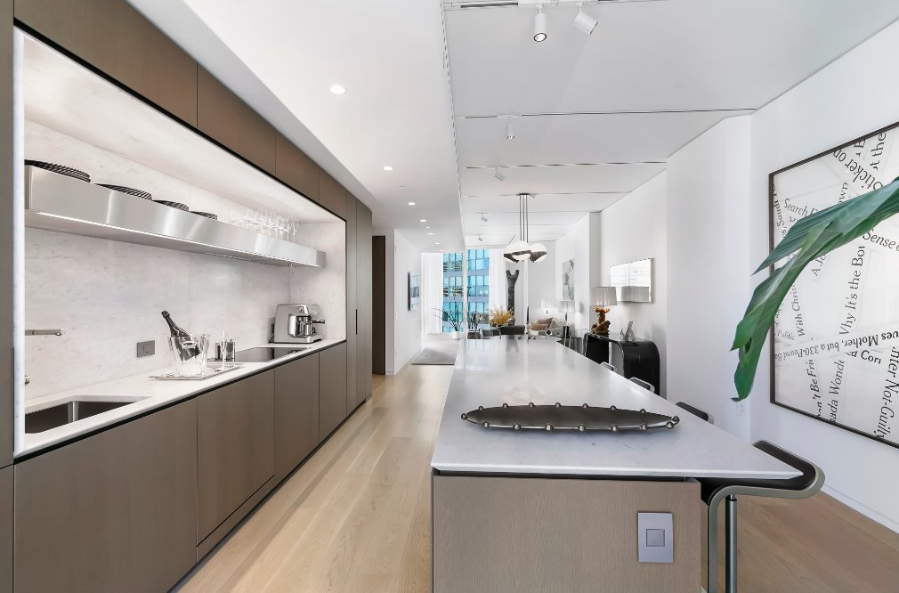 The building is getting its final finishing touches now, including two new model apartments. The lobby and all of the amenities are totally complete as well, and move-ins are starting in December. The new model residences located on the 36th floor offer stunning city views, Foster + Partners-designed custom millinery, incredible stonework including Carrara marble with a knife edge’s finish in the kitchen and Silver Striato travertine in the bathroom.