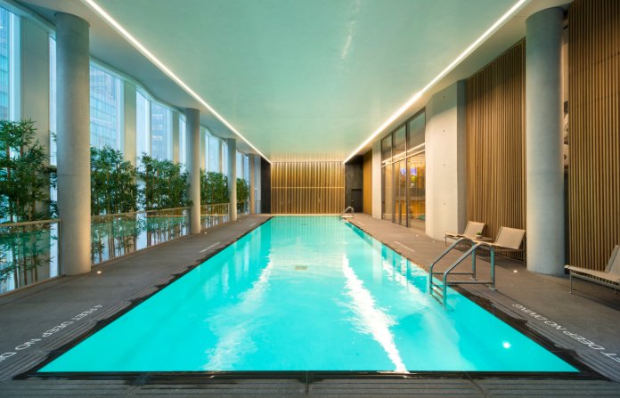 The list of building amenities is long and luxurious. They include passenger elevators that travel at an impressive 1,400-feet per minute, a wellness facility with a 60-foot sunlit swimming pool, a cardio room, a weight room, a pilates/ballet room and a yoga room. There is also a sauna, steam room, spa treatment rooms, his and hers private changing rooms and showers, residential lounges, a residential library, a world-class culinary market and a five-Star restaurant. In addition, the building anticipates LEED Silver certification