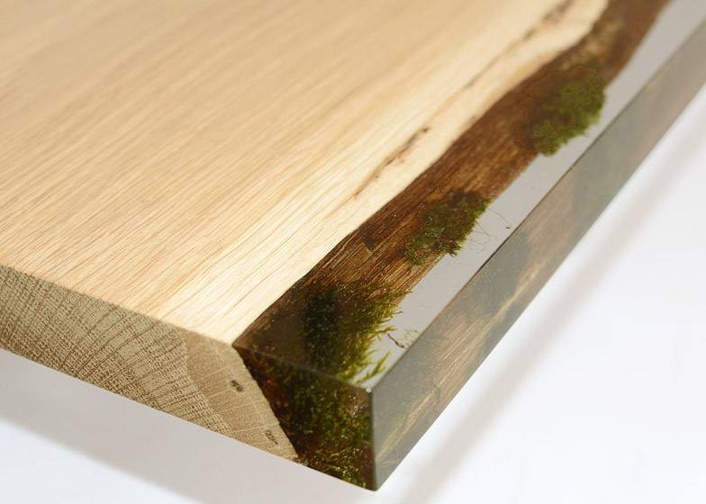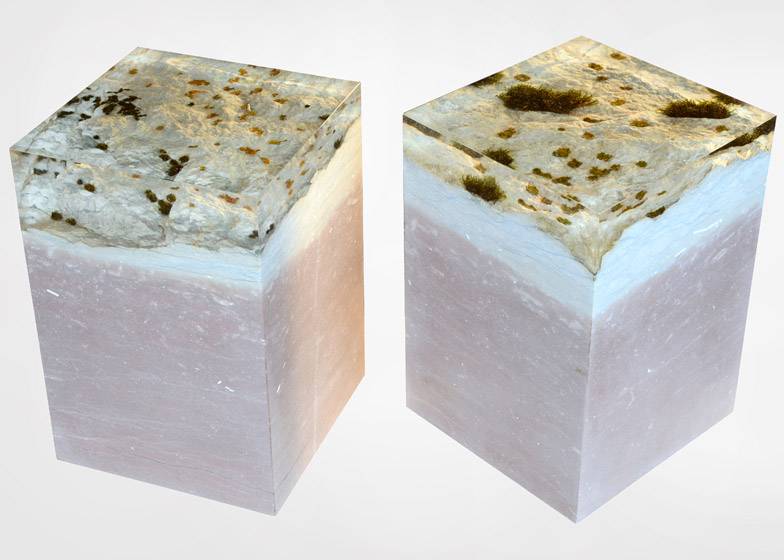 Alcarol’s Dolomyth pieces feature chunks of mountain rock taken from an abandoned quarry, topped with mosses and lichens frozen in the translucent resin.
