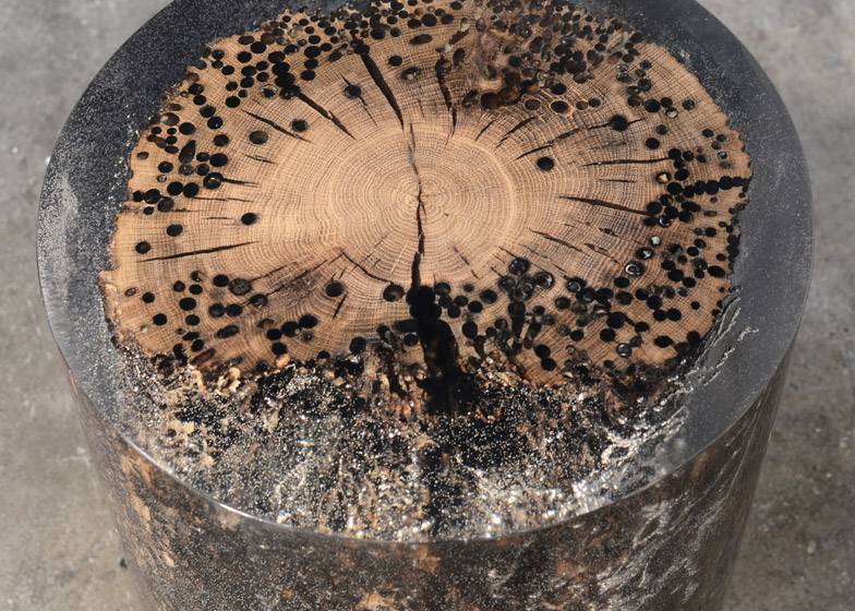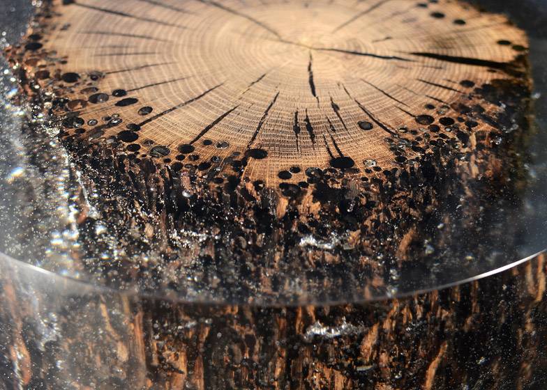 The design duo’s FishEye stools and side tables, for instance, showcase sections of timber poles fished out of Venice’s canals, which are hewed by the weather and Teredo Navalis—shipworms that carve out patterns of circular holes around the upper layers of the oak logs. Forti and Dal Farra then fill cracks and holes in the wood with clear resin, pouring the substance into a cylindrical mold outfitted with swivel casters on its base.