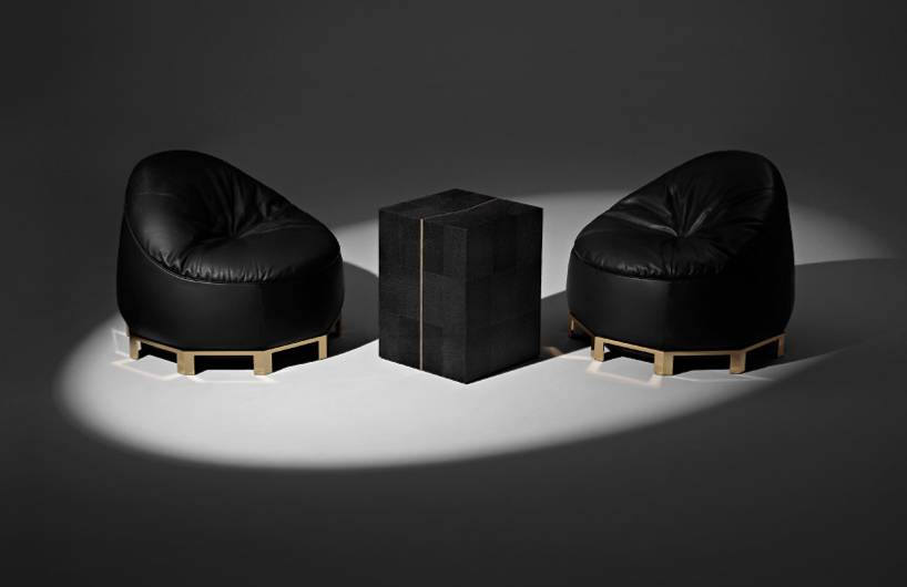 Comprised of three matte black pieces, the capsule collection features two different beanbag styles (one in stitched leather, the other shearling), each buoyed by a minimalist brass frame, along with a trunk bar/drinks cabinet accented with linear gold detail.