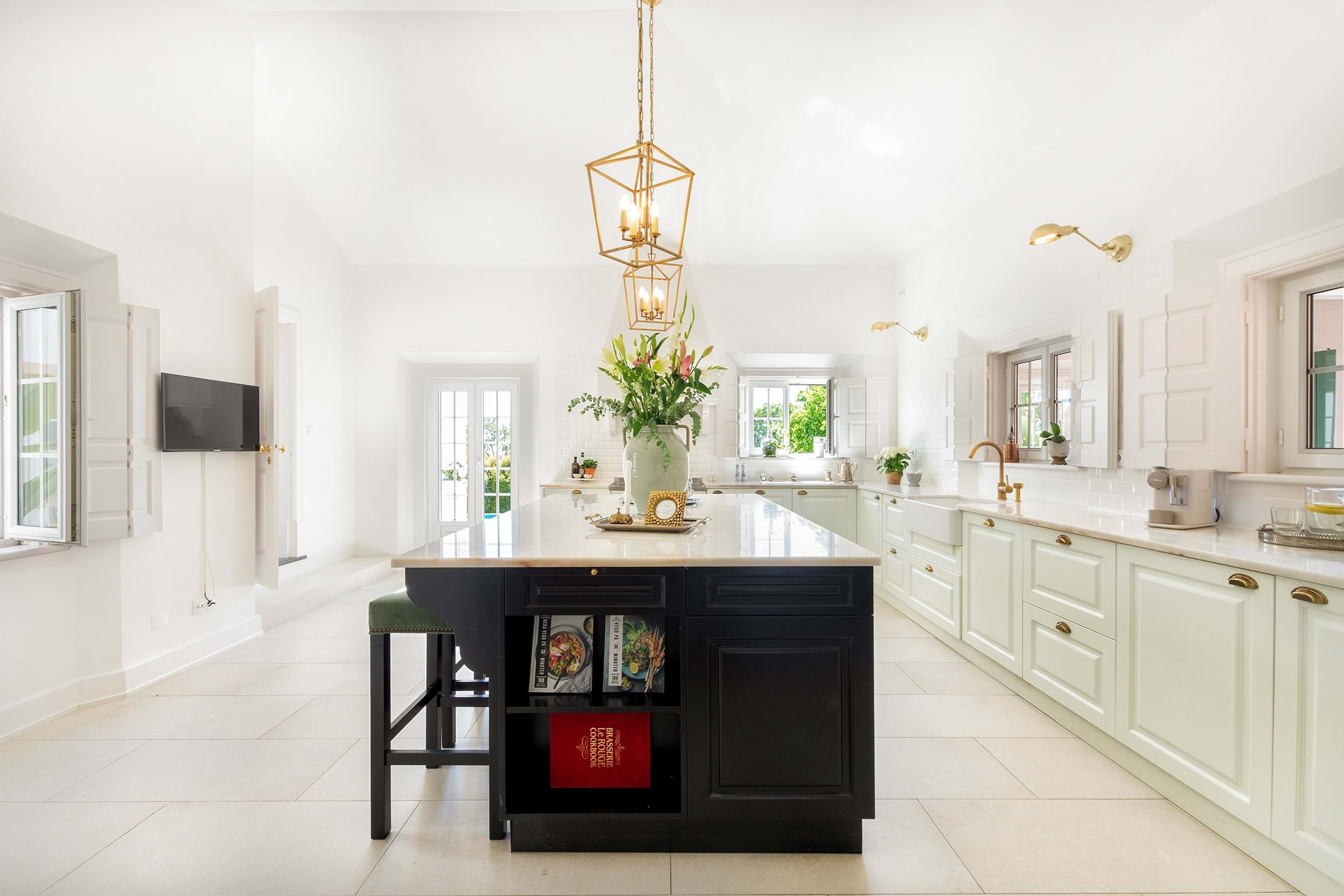 This beautiful south-facing property is nested in a tranquil private 2674 sqm plot on the hill overlooking the Estoril Golf Course. The main 828 sqm 6-bedroom 6-bathroom house is built in a classical style and is surrounded by a vast lush garden, featuring a large outdoor pool, a vegetable garden, and a garage for 2 cars.