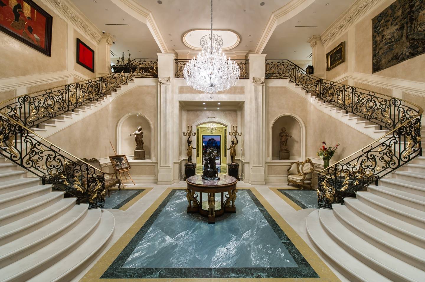 Palazzo di Amore’s main residence is over 35,000 square feet; there are 12 bedrooms, 23 bathrooms, and the master suite, alone, is 5,000 square feet. The home is well protected, having three sets of double gates, and a “security guard house.”