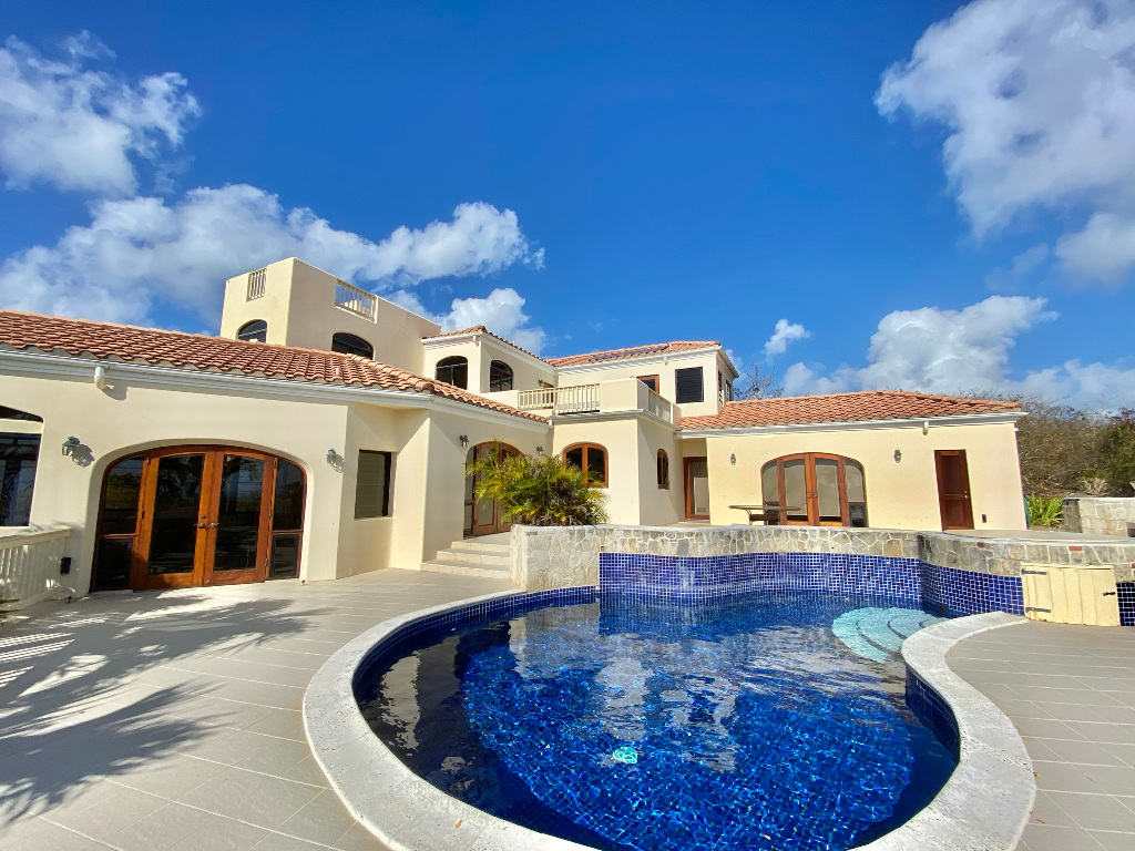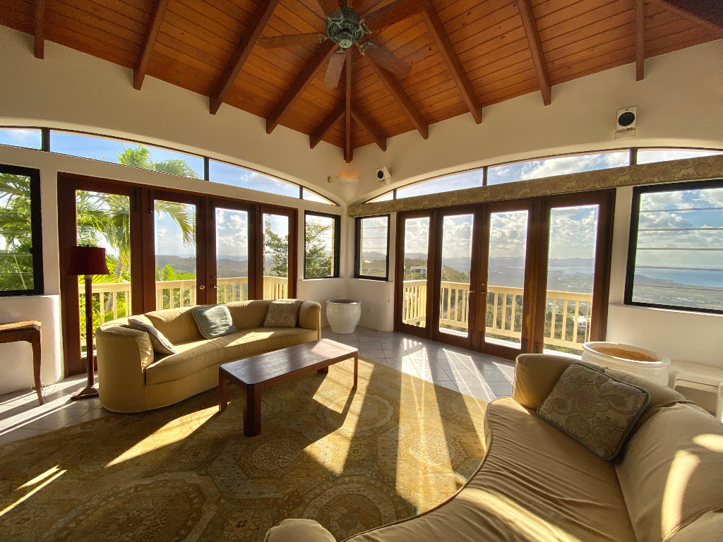 The Mill in Seven Hills! This three-bedroom, three-bathroom architect-designed residence with a studio apartment sits 525 feet above the blue waters of the Caribbean and enjoys a 270-degree view encompassing Christiansted, the north and south shores, and Buck Island. The Mill in Seven Hills blends traditional Danish West Indian architectural elements such as double-radius archways, windows, and doors with ideas from the American Southwest like rounded interior and exterior corners. Built in 1993, a sugar mill surrounds an interior stairway leading from the dining room and main floor to the master bedroom. The 1.1 acres is home to an African tulip tree, bougainvillea, poor man’s orchid trees, pink cedar trees, Ixora, an African Baobab tree, aloe plants, Flamboyant trees lining the driveway, and native ginger Thomas.