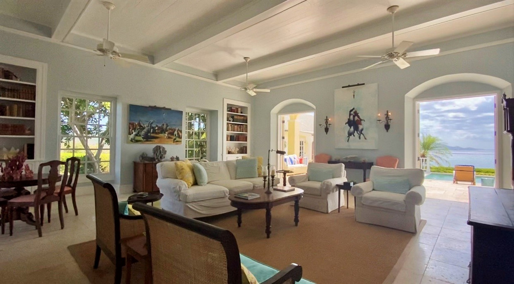 Mango Hill Greathouse, built in 2006 in the style of a traditional Caribbean plantation house, is situated on a private hilltop to ensure cooling trade winds and 360-degree sparkling sea views. The property features French doors, covered galleries, and graceful stone arches throughout. There are three very spacious air-conditioned bedrooms in the main house, all with en suite baths and egress to the upper-level, sea-facing gallery. In addition, there is a fourth balconied bedroom with a separate living room in the poolside air-conditioned guesthouse. The residence frames a 40’ heated swimming pool and faces the sea views to the northwest guaranteeing glorious sunsets! Mango Hill Greathouse, located in St Croix’s premier gated and beachfront community of Shoys, is a 10-minute walk to Buccaneer Hotel’s beaches, tennis courts, 18-hole golf course, beachfront restaurants, and spa. Christiansted’s art galleries, acclaimed restaurants, and shopping boutiques are a mere five minutes from Mango Hill Greathouse. The purchase includes an adjacent, buildable .73-acre lot that has gorgeous sea views. This bonus lot could be further developed, sold for additional capital, or kept for added surrounding green space and privacy.