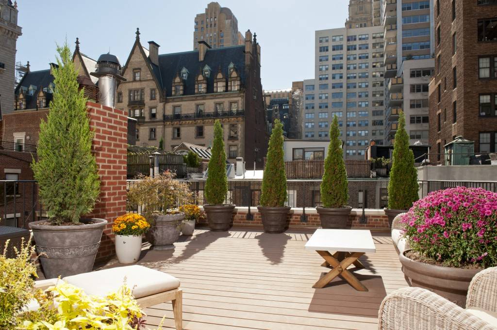 Costing her $2.55 million, the 1,200-square-foot co-op apartment has two bedrooms; two bathrooms; a living room with lots of space, custom-built cabinetry, and a stereo system; a dining area; a kitchen with 18-foot ceilings, tons of counter space, cabinets, and wine storage; a gym; and a large terrace with greenery and views of the Upper West Side.