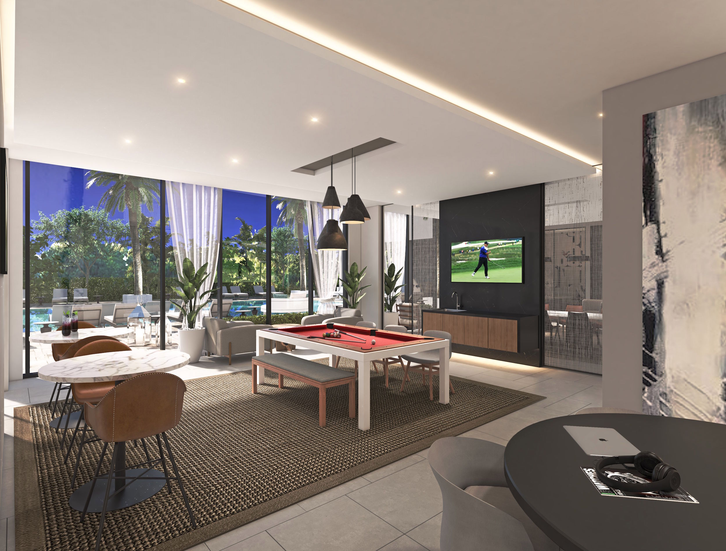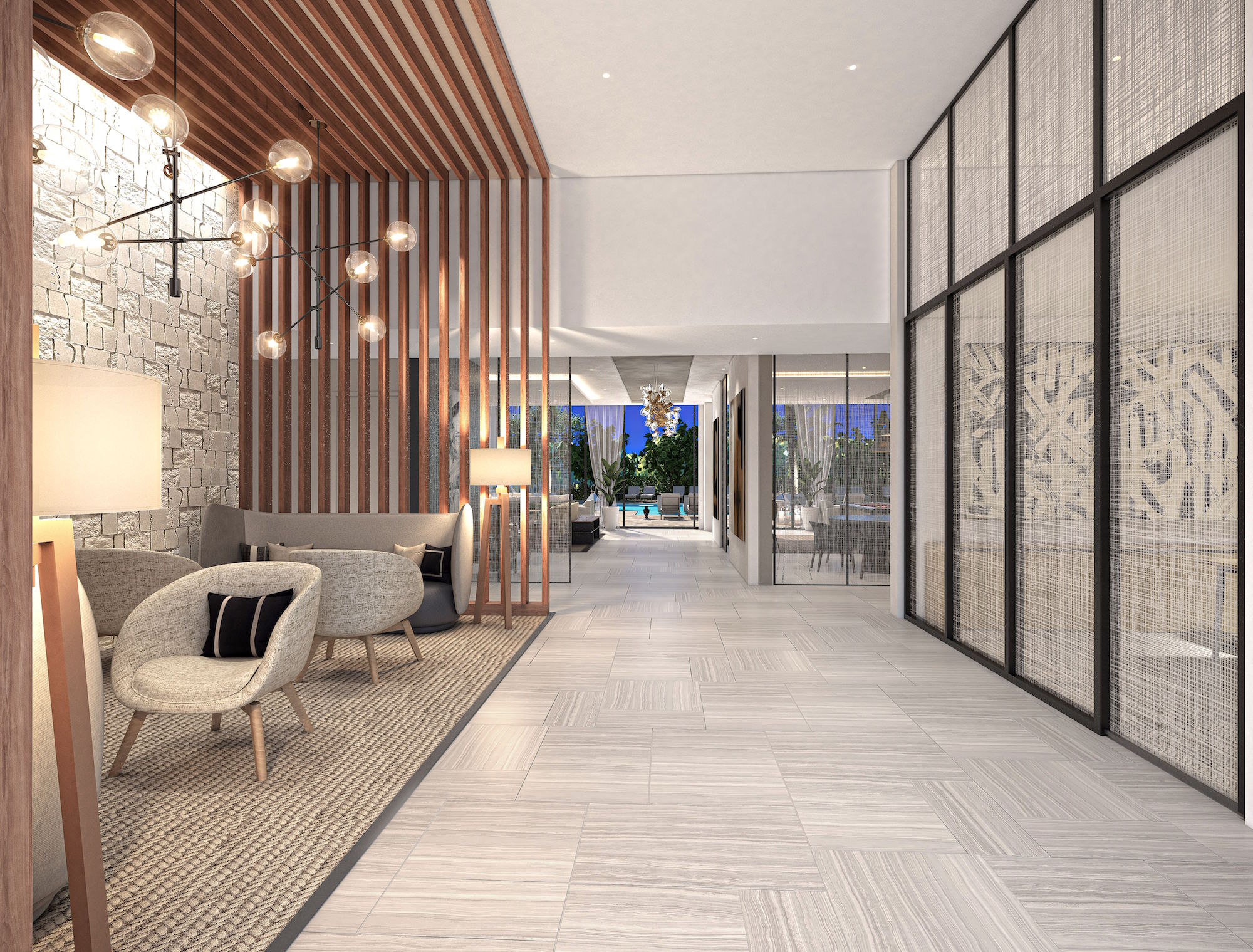 The Oasis Pointe lobby features double-height ceilings that open to a marina, waterway, and pool amenities. The building features high-end flooring, modern furniture, LED lighting, indoor glazing, and customized millwork that evokes tranquil and peaceful waterfront living.