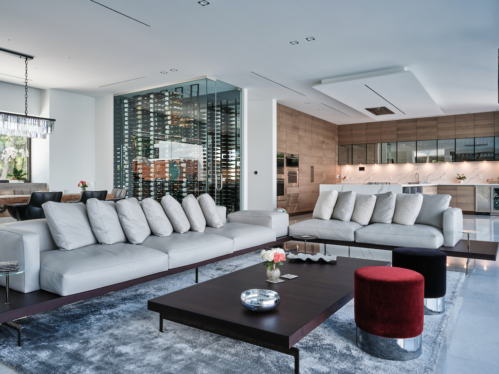 In addition, this residence has an Italian-designed kitchen, a wine cellar available for 1,000 bottles of wine, a motorized 75-inch tv that dismounts from the ceiling, a 60-foot-long infinity pool, a movie theater, a glass elevator, which overlooks a cascading water feature at the front of the home, and much more.
