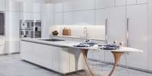 The sleek, elegantly designed kitchen features pristine quartz counter tops and top-of-the-line appliances that would make any home chef blush. Also included is a wine bar and a cooler.
