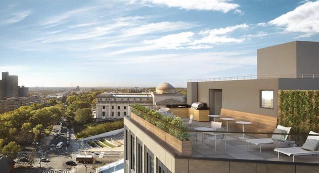 This three bedroom, two-and-a-half bathroom residence features over 1,600 square feet of interior living space and a private balcony with panoramic views of the Manhattan skyline, Brooklyn Museum and Prospect Park. The interiors feature architectural textures of marble, steel and natural wood. The open floor plan kitchen has walnut cabinetry, fully integrated Thermador appliances, Pietra del Cardosa stone countertops and Blanco satin polished sinks outfitted with Dornbracht faucets.