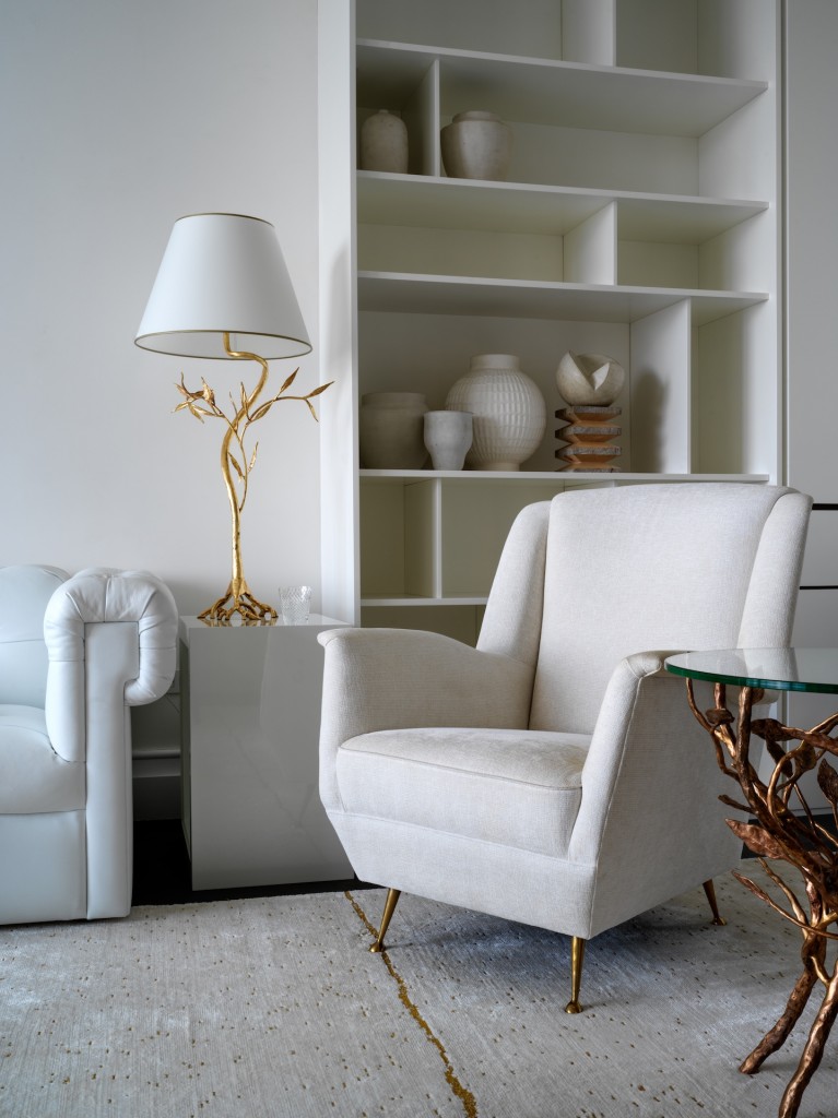The living room invites guests with satin white millwork on all walls, Italian mid-century club chairs, sofa and tête-à-tête by Gregory Rockwell.