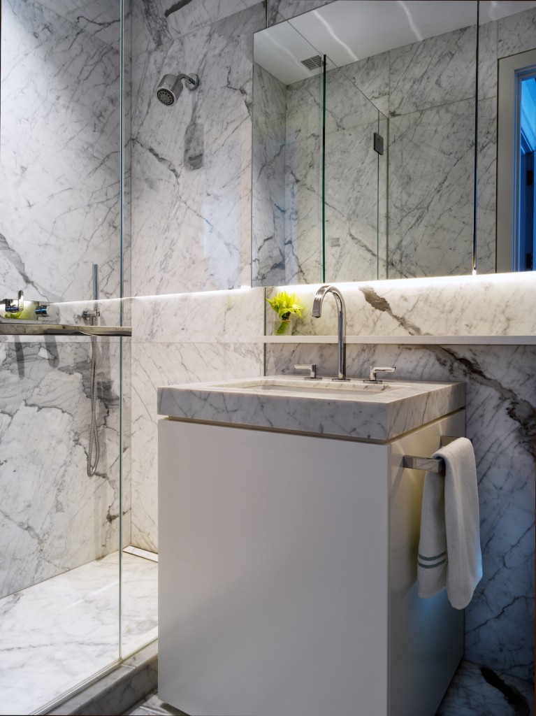 The guest bathroom features large-format Statuarietto Marble. The custom frameless medicine cabinet, Fantini Linea Series accessories in chrome finish and Mitered edge stone shower niche detail add a touch of elegance to the home.